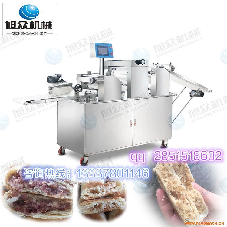 XZ-15C三道擀面酥饼机,采用三段渐进式打薄再将面皮压成合适的厚度。由自动出馅机将馅料充填至面皮上,经卷面轮将面皮卷成圆...