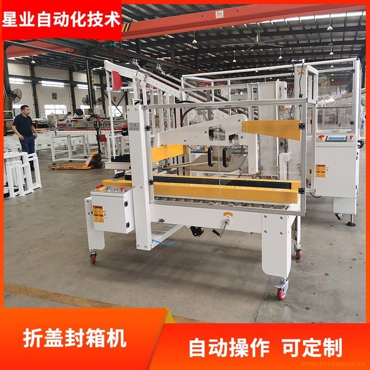 折盖封箱机可自动完成纸箱上部折页的自动折合,根据需要可完成上部胶带或上下胶带的自动粘贴,无需人手作业;操作简单、使用...
