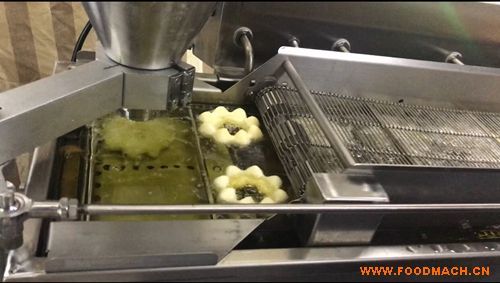 “沉炸”的形式去炸波提圈,使得甜甜圈两面色泽均匀。只需要将面团倒进料斗,无需手动操作成型。