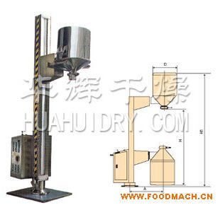 杆,料门与料桶一起上升,启动翻转操作杆,料桶即可番转180度,呈底桶向上姿态并移动到所需位置,利用料门上出料蝶阀,可很容易将物料加入所需的工艺设
