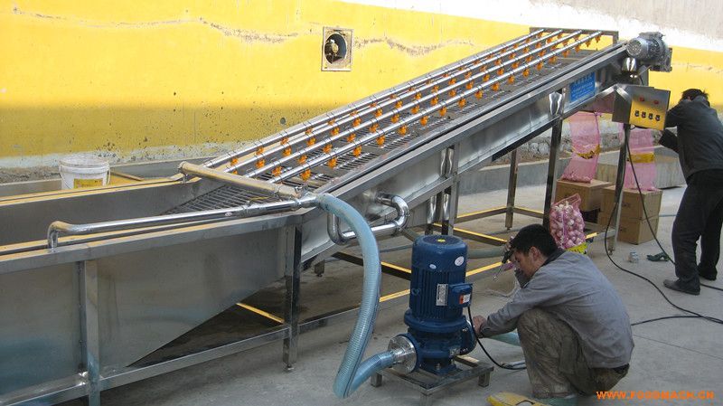 本清洗机别名;异物去除清洗机。主要采用鼓泡,冲浪,毛辊,毛刷或滚筒和提升处喷淋清洗。通过高压喷淋,毛刷清洗,气泡清洗三种方式将产品表面的杂志处理干净;机体内有四根大毛刷,将物料下压通过可以去除长毛发,网带提升处有喷淋管,将物料用水清洗干净。