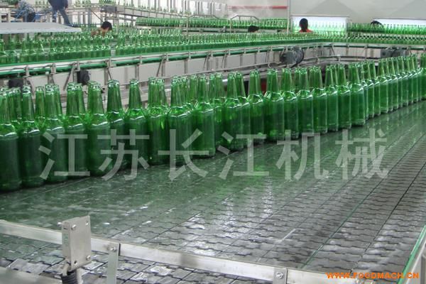 * 在灌装压盖机和贴标机前分别配置无压力输瓶段,解决了中高速瓶装生产线中由多列输瓶变单列输瓶时诸如挤瓶、卡瓶、倒瓶、破瓶、噪声大、不稳定可靠等问题,它是由一倾斜的多列(*多处≥12列)速度不等的三段输送链组成,长约8米,由三个变频调速电机传动,设有满瓶、积瓶和供瓶数(单位时间的供瓶数)的光电检测,根据灌装机或贴标机发出的速度脉冲讯号,通过PLC自动同步跟踪,改变输送链的速度,以保证连续、无挤压地供瓶,此段还设有导瓶排瓶装置。