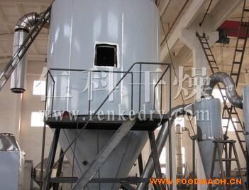 空气经过滤和加热,进入干燥器顶部空气分配器,热空气呈螺旋状均匀地进入干燥室。料液经塔体顶部的高速离心雾化器,(旋转)喷雾成极细微的雾状液珠,与热空气并流接触在极短的时间内可干燥为成品。成品连续地由干燥塔底部和旋风分离器中输出,废气由风机排空。